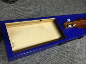 The frame of the case is made of lightweight poplar with panels made of 1/8 inch plywood. The mahogany fretboard is surrounded by a stained and painted hourglass dulcimer shape. The victim, er recipient of this unique gift is retired from the United States Air Force so the instrument is painted one of the several varieties of USAF blue.