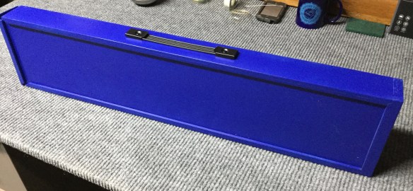 The frame of the case is made of lightweight poplar with panels made of 1/8 inch plywood. The mahogany fretboard is surrounded by a stained and painted hourglass dulcimer shape. The victim, er recipient of this unique gift is retired from the United States Air Force so the instrument is painted one of the several varieties of USAF blue.