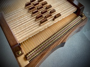 The modern improvements in the construction of this instrument include a solid spruce soundboard with tuned bracing, a one piece laminated frame, and quiet chord bars mounted on  Delrin and steel pin combs. The chord bars, covers, side veneer, bridges, and tailpiece are made of African mahogany that has been stained dark brown. The musician requested that I not apply note labels under the tuning pins so I included a wooden tuning strip/duster that can be positioned under the strings to aid tuning.