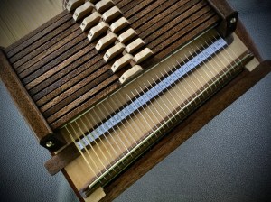 The lock bars of an autoharp function much like their adjoining chord bars… held aloft by springs when not in use and locked down by some sort of a wedge. The swarmandal’s lock bars will be swapped in and out as needed and seated, without springs, against the strings  by a magnetic cover.