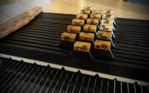 The 1/4″ side veneer, tailpiece, and chord bar holders are made of red oak with an interesting “bark intrusion”. The eighteen maple chord bars are lacquered black and the buttons have been randomly burnt with a mini torch to resemble the oak trim.