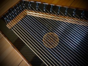 So, how does this carbon fiber sound? For us, it is too soon to say anything other than “different”. Folks who play the Daigle carbon fiber harps report that they are loud, bright, and have a “crazy amount of sustain”. It does seem louder than our other instruments but we need a “breaking in” period before we can assess its tone, articulation, and presence. Almost as important is the expectation of greater structural stability and the attractive visual combination of carbon fiber and red oak.