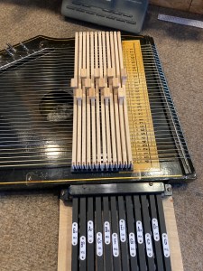 Most of my builds have been set up for playing in the area above the chord bars with the high treble strings unobstructed by the chord bar covers. This chord set is positioned closer to the tuning pins to permit play below the chord bars at the anchor end. Many of the old OS A models were arranged this way until playing the instrument upright became common and the bar set was moved south by their owners or the factories. This instrument is designed to be played on the musician’s lap with the left hand at the chords and the right hand playing near the anchor bridge.