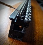 The twelve, 5/16 inch-wide chord bars are arranged in two rows as was probably the intention of the builder. They rest upon #6 steel pins driven into Delrin bases. The Seeger autoharp bore round buttons that were sometimes broken. These chord bars were fitted with comfortable dished trapezoidal buttons made of rosewood.