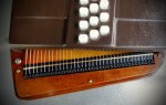 The instrument is set up as a thirty-seven string diatonic in the keys of G and D. The fifteen chord bars are arranged in three rows with the major chords in the middle, the sevenths on the top, and the minors in the bottom row. The two chord bars nearest the tail end are lock bars. One is a D lockbar that mutes the strings in the array that aren’t in the key of D (four C strings and one F). The G lockbar mutes the strings in the array not in the key of G ( two C# strings and one F). By muting the unnecessary notes the player is less likely to play them by mistake.