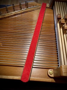 On the reverse side of the tuning strip is red felt. It prevents the wooden strip from scratching the soundboard and doubles as a convenient tool to remove dust under the strings.