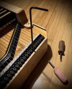 A wood handled allen wrench was supplied with the tuning assembly but I made an additional, smaller one that seats magnetically in a hole at the end of the tailpiece. It’s handy, right there near the tuners and not lost amid all of the other paraphernalia that travels with the instrument.