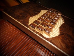 The instrument has a 1/4 inch thick solid spruce soundboard. The one piece frame is laminated maple pinblock with a laminated maple back. The side veneer, end cover, and chord bar covers are made of curly maple. Chord bars are maple with alternate bars painted black. Black tuning pins, bridges, Schreiber fine tuners, and purfling complete the black/white motif.