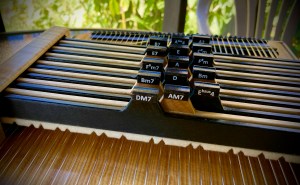 The fifteen chord bars are made of curly maple. The contrasting buttons are capped with walnut.