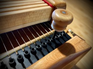 The fifteen maple chord bars feature cherry buttons with the lateral dishing (rather than longitudinal dishing) preferred by the player. They move on #6 steel pins set into Delrin bases. The chord felt is yet uncut pending the player’s preferences.
