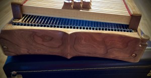 The twenty-one maple chord bars are capped with walnut buttons and are mounted upon combs made of #6 bridge pins and Delrin bases. Just to be different, I kinda hybridized the chord bar covers by making a shell out of walnut and very thin birch plywood. Its top surface is veneered with sequence-matched walnut burl. There is no distinct advantage for making it this way but the larger areas of felt damping on the underside seem to make the chord bars quieter.