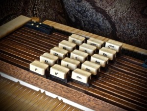 Apart from the paint job, it differs little from my standard instrument. It’s a thirty-six string chromatic with fifteen thin chord bars painted in a rainbow pattern ( it might be said that all of the chords are “color chords”). The quiet chord bars are carried on #6 steel bridge pins driven into Delrin bases. Structurely, it features a laminated pin block frame, birch ply back, and a solid poplar soundboard. A peace symbol rosette is inlaid in the sound hole and an there is an additional sound hole in the back that makes the sound more audible to the player’s left ear and is useful for handling the instrument.