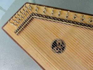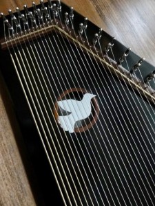 Here is a new custom autoharp commissioned by a musician and performer from Ontario. He desired a bright white “dove of peace” shaped sound hole on an all black body. The dove shape that he chose was too delicate to cut into the soundboard so I inlayed it in a walnut veneer ring with a bright white plastic material.