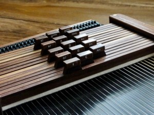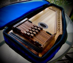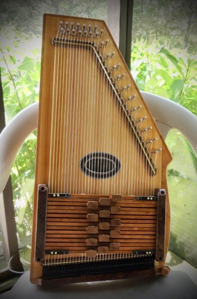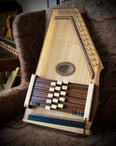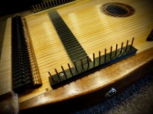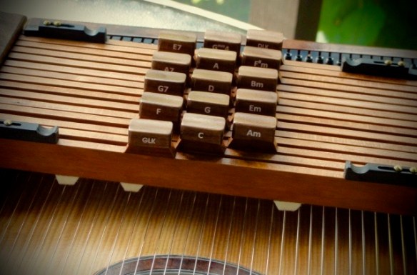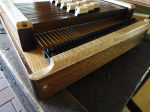 The instrument is set up as a thirty-seven string diatonic in the keys of G and D. The fifteen chord bars are arranged in three rows with the major chords in the middle, the sevenths on the top, and the minors in the bottom row. The two chord bars nearest the tail end are lock bars. One is a D lockbar that mutes the strings in the array that aren’t in the key of D (four C strings and one F). The G lockbar mutes the strings in the array not in the key of G ( two C# strings and one F). By muting the unnecessary notes the player is less likely to play them by mistake.